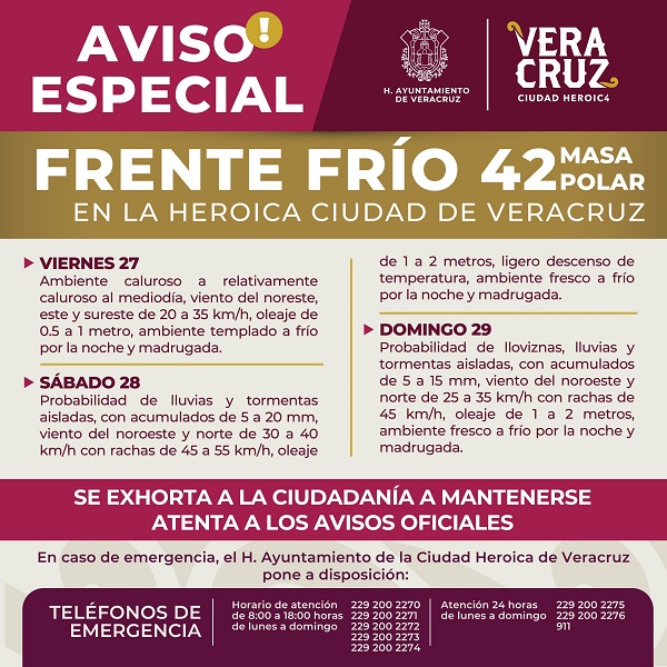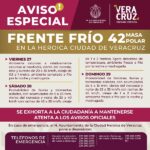 La dirección de Protección Civil Municipal de Veracruz informa a la ciudadanía que, ante el ingreso del frente frío 42 al Golfo de México, se prevén cambios en el estado…