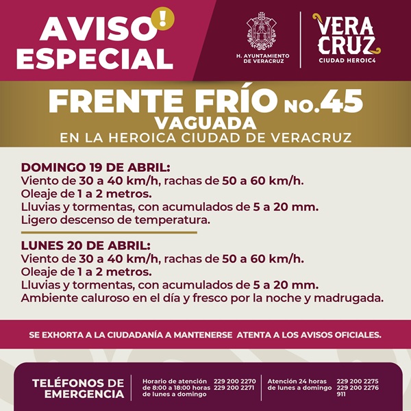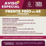 Debido a que durante este domingo 19 y lunes 20 de abril podrían presentarse vientos, lluvias y oleaje elevado por el paso del Frente Frío 45, la dirección de Protección…